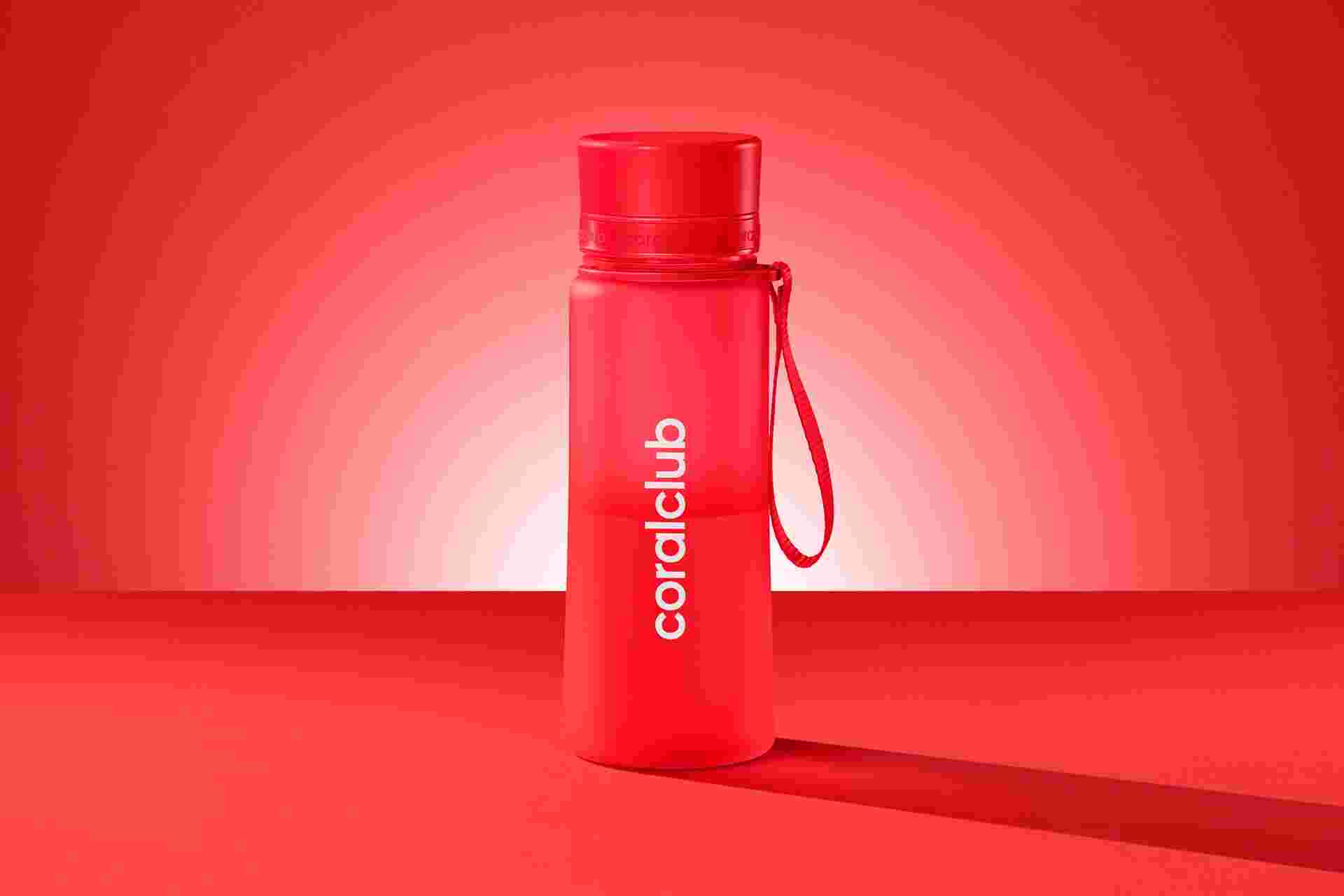 Міцна, екологічна та легка пляшка Coral Club чудово підійде для поїздок, прогулянок або занять спортом.